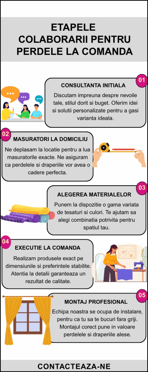 Nu trebuie sa iti faci probleme daca nu stii cum sa alegi perdelele la comanda in Bucuresti. Suntem aici sa te ajutam in fiecare etapa. Iata care sunt pasii pe care ii urmam la fiecare colaborare: